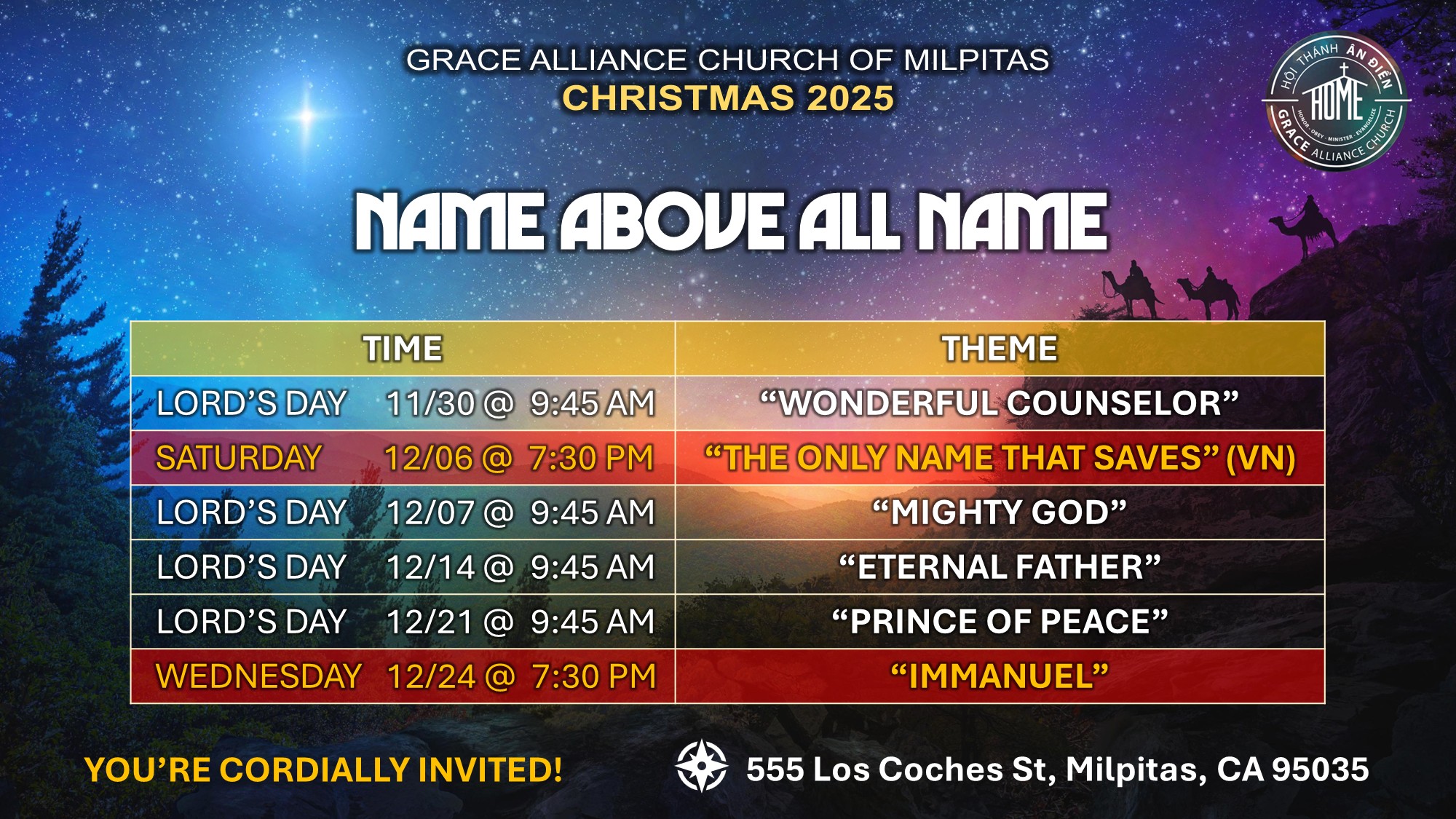 | Sunday | 9:45 AM 11:15 AM | ENGLISH WORSHIP SERVICE LỄ THỜ PHƯỢNG TIẾNG VIỆT |